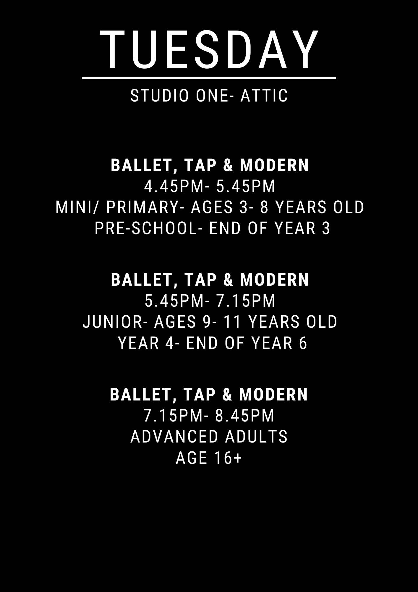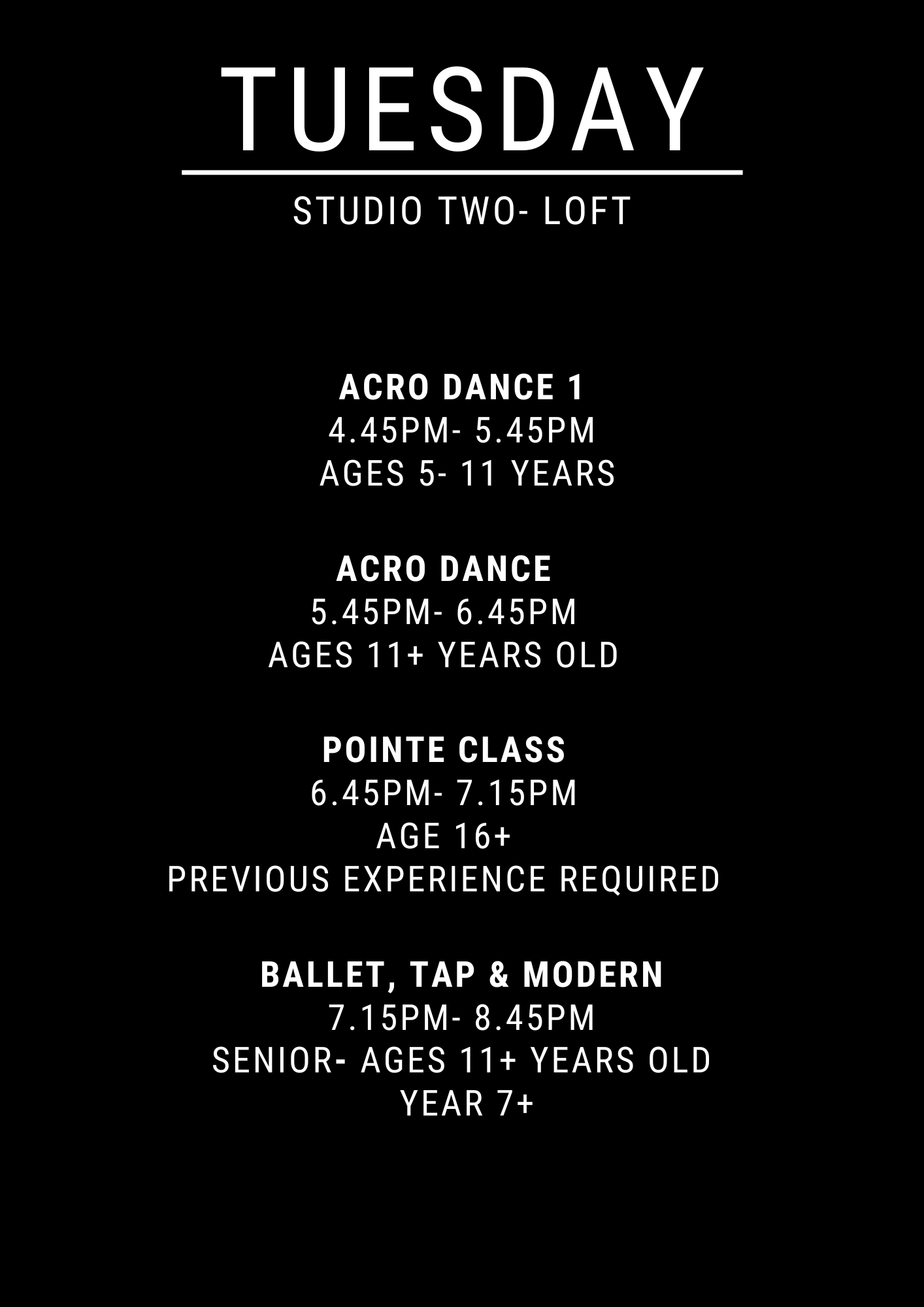 We offer one class covering Ballet, Tap & Modern, or try one of our add-on classes including Acro!